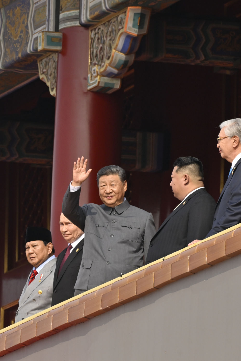 2025年9月3日,纪念中国人民抗日战争暨世界反法西斯战争胜利80周年大会在北京天安门广场隆重举行。这是中共中央总书记、国家主席、中央军委主席习近平等在天安门城楼上。