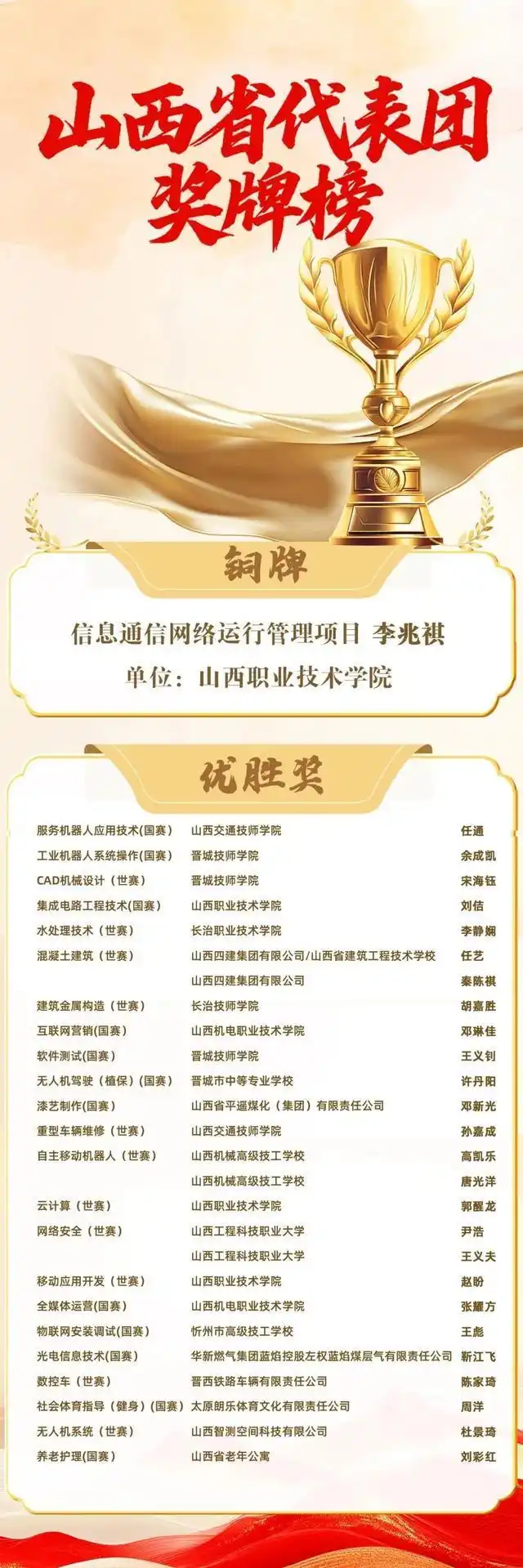 来自山西职业技术学院的选手李兆祺在“信息通信网络运行管理”项目中发挥出色,为我省赢得了1枚铜牌。我省9个项目进入前十,3个世赛选拔项目选手入围第48届世界技能大赛中国集训队。山西代表团被大赛组委会授予“突出贡献奖”,李兆祺获得“最佳选手奖”。