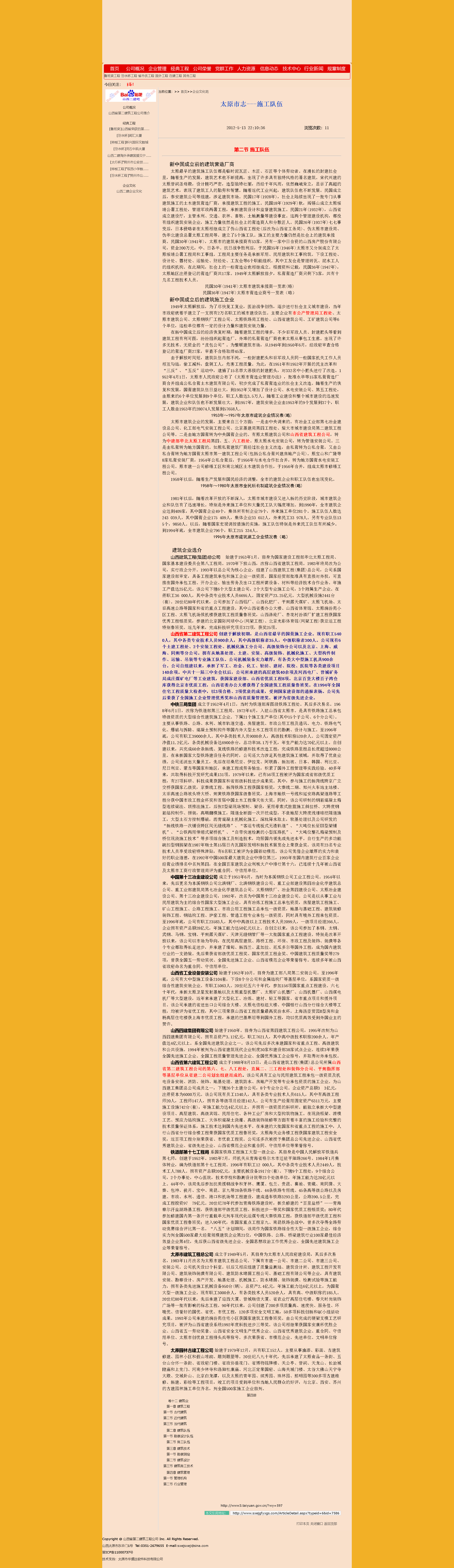 山西省第六建筑工程公司 成立于1988年8月13日,是山西省建筑工程(集团)总公司所属山西省第二建筑工程公司的第六、七、八工程处,直属二、三工程处和装饰分公司、平朔指挥部等基层单位从省建二公司划出组建而成的。该公司具有工业与民用建筑工程承包一级资质及机电设备安装、消防、装饰、地基处理、建筑防水、房地产开发等专业承包资质的施工企业。为山西建工集团总公司成员之一,下辖26个土建分公司,8个专业分公司。企业资产总额33亿元,注册资本为6000万元。该公司现有员工1340人,具有各类专业技术人员615人,其中有高级工程师20人,工程师147人,拥有各等级项目经理142人。公司有生产经营用固定资产6311万元,主要施工设施742台(套),年施工能力达4亿元以上,并拥有一级资质的科研所。能独立承担大中型建设项目、高层建筑、高级宾馆、民用住宅、各种工业厂房和大型构筑物施工。在现浇框架、滑模工艺、预应力结构施工、大体积混凝土浇灌、高级装饰装修等方面有着丰富的施工经验和完整的技术质量保证体系,施工技术达到国内先进水平。在承建的大批国家和省重点工程的施工中,人行山西省分行综合楼工程荣获国家优质工程鲁班奖,太原海关业务楼工程获国家建筑工程安全奖,近百项工程分别荣获省、市优良工程奖。公司还多次被授予集团总公司先进企业、山西省优秀建筑企业、省级先进企业、山西省模范企业和重合同、守信用单位等荣誉称号。