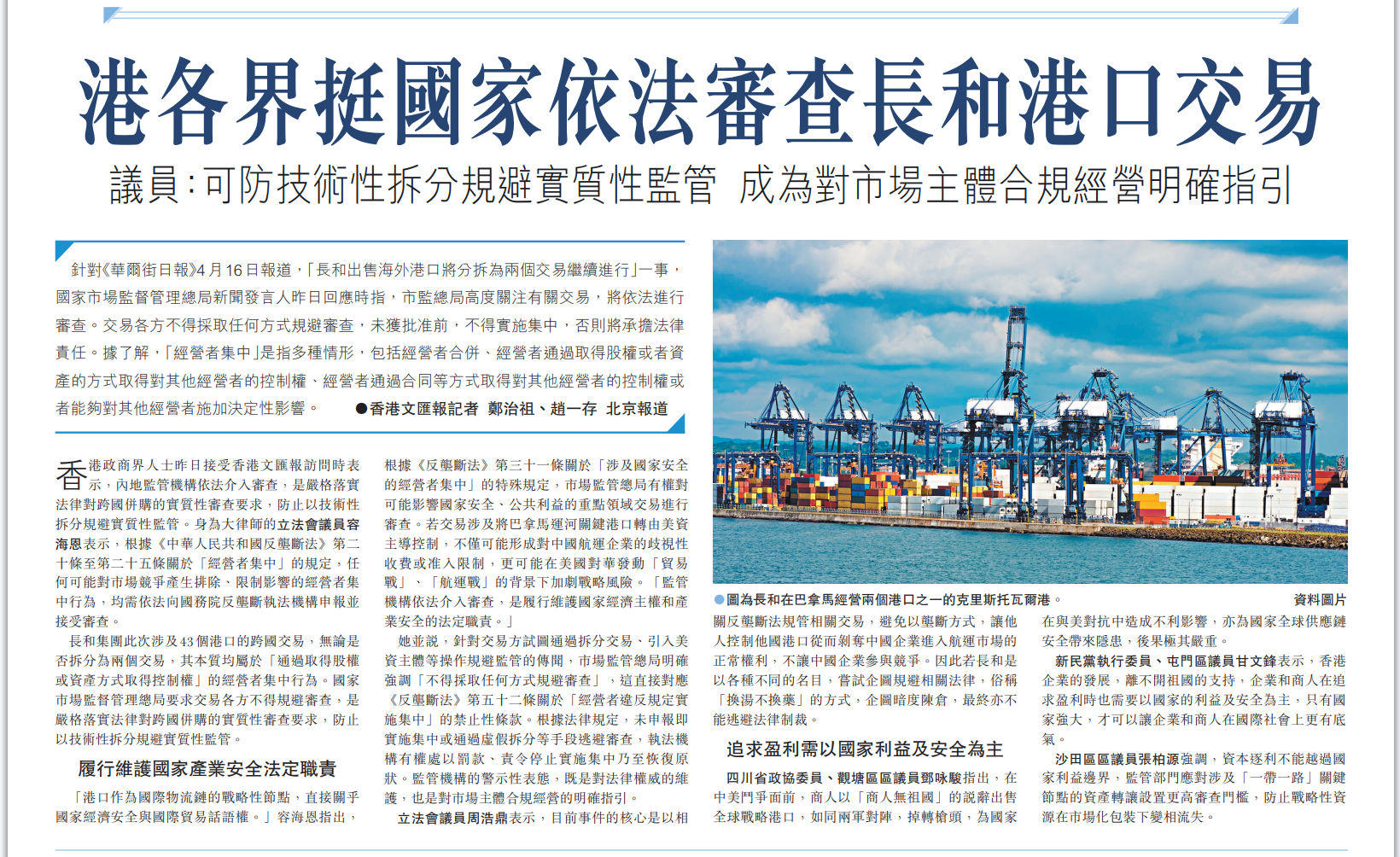 长和集团作为在香港起家、业务遍布全球的大企业,应该知道交易影响之重大,尤其在当前美国对华贸易战正酣,美国甚至恐吓要向中国船只征收天价港口费,长和集团更应对交易慎重考虑,三思而行,更要把国家利益置于企业利益之上。