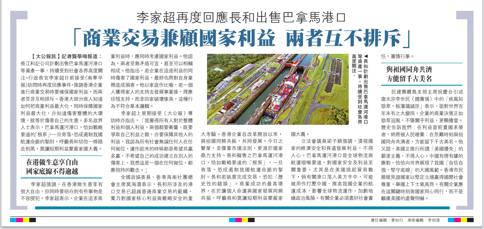 【大公报讯】记者龚学鸣报道:长江和记公司计划出售巴拿马运河港口等资产一事,持续受到社会各界高度关注。行政长官李家超日前接受《南华早报》访问时再度回应事件,强调香港企业进行商业交易时要确保国家利益,而两者并非互相排斥。香港大部分商人知道如何把商业利益最大化,同时保障国家利益最大化,亦知道伤害整体的大环境,就等于伤害自己的生意。多名政界人士表示,巴拿马运河港口,恰如战略要道的「根系」,一旦旁落,恐成遏制我国航运命脉的掣肘,呼吁长和切勿一条路走到黑,莫让短期利益蒙蔽家国大义。