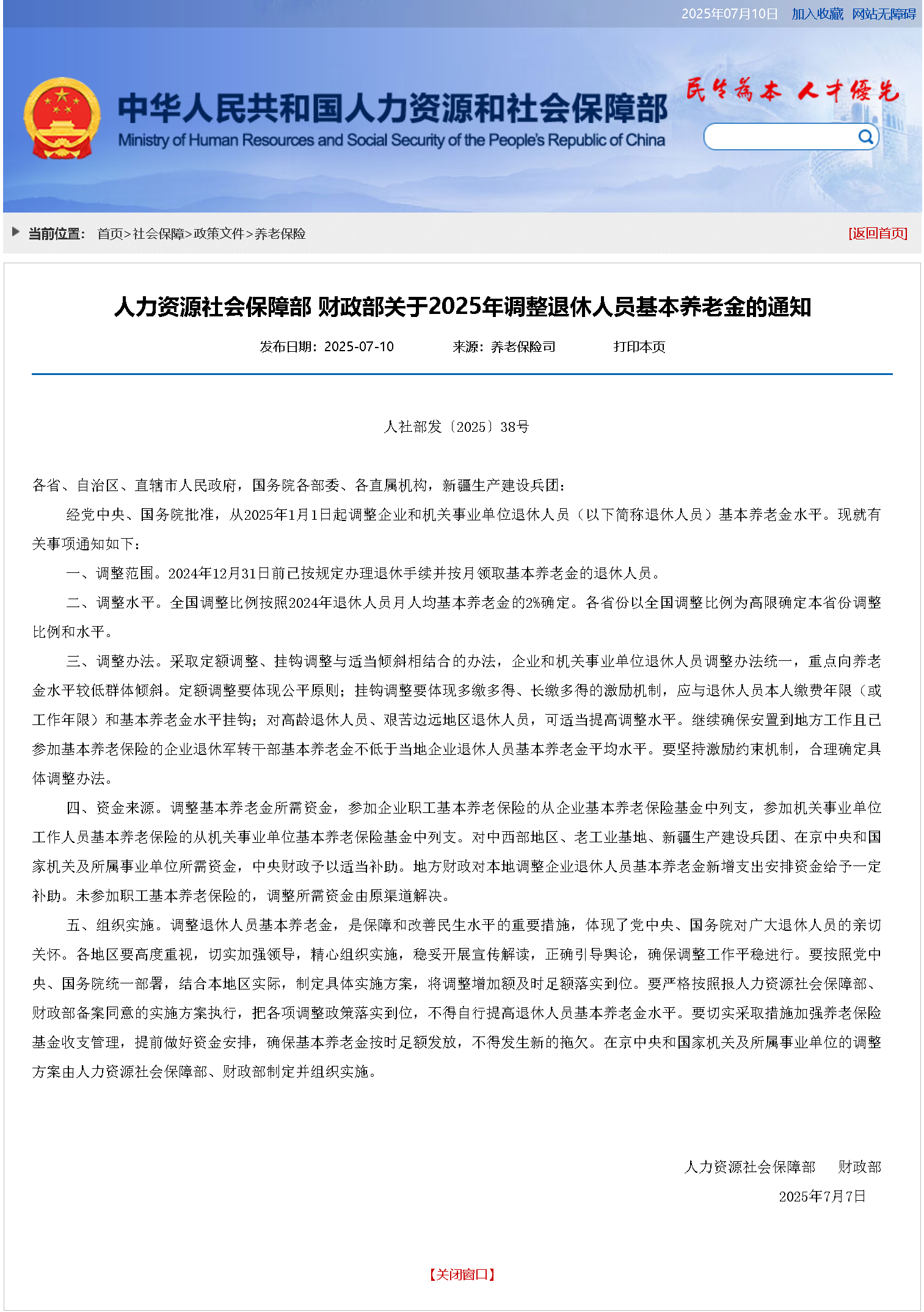 人力资源社会保障部 财政部关于2025年调整退休人员基本养老金的通知