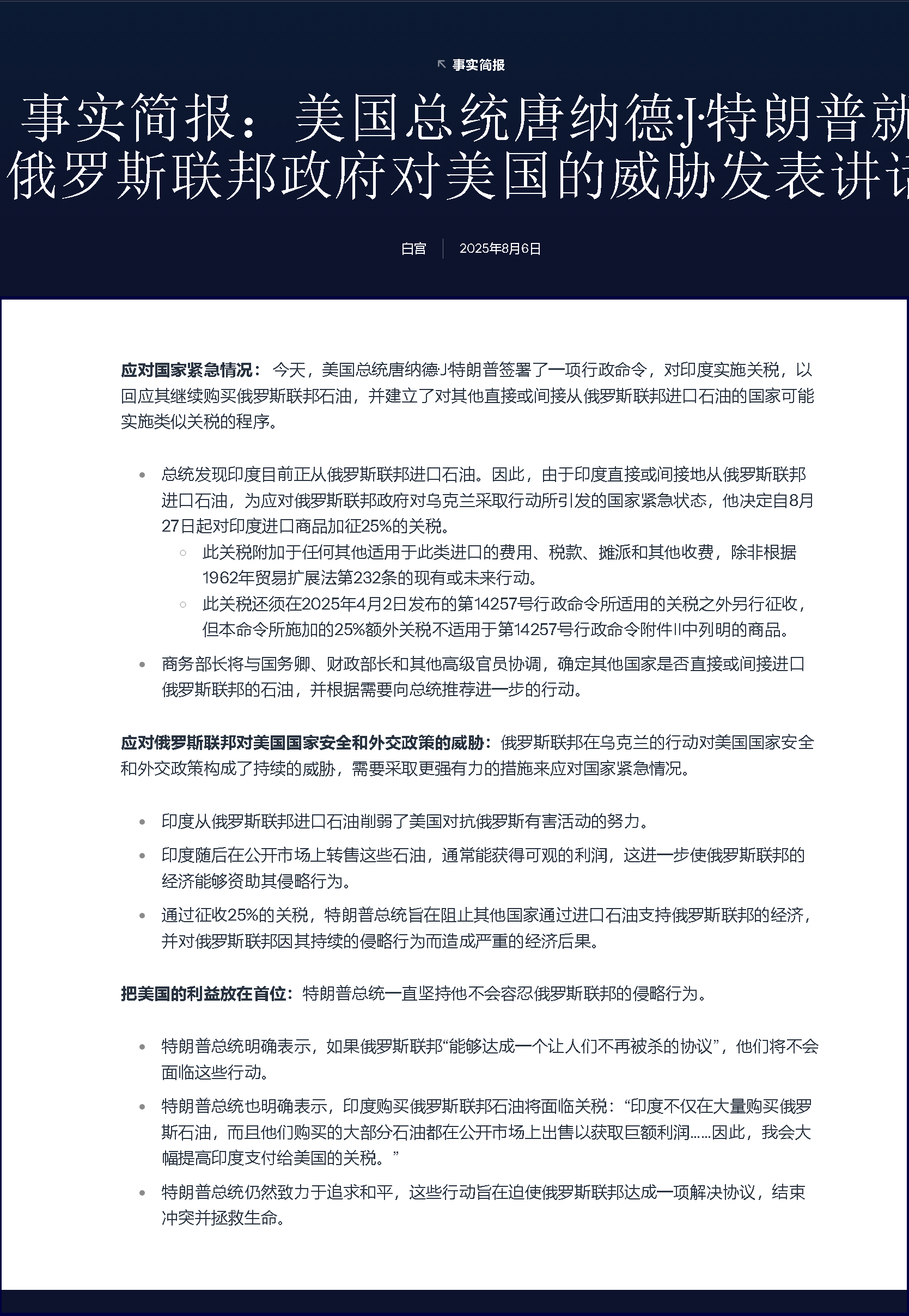 应对国家紧急情况: 今天,美国总统唐纳德·J·特朗普签署了一项行政命令,对印度实施关税,以回应其继续购买俄罗斯联邦石油,并建立了对其他直接或间接从俄罗斯联邦进口石油的国家可能实施类似关税的程序。