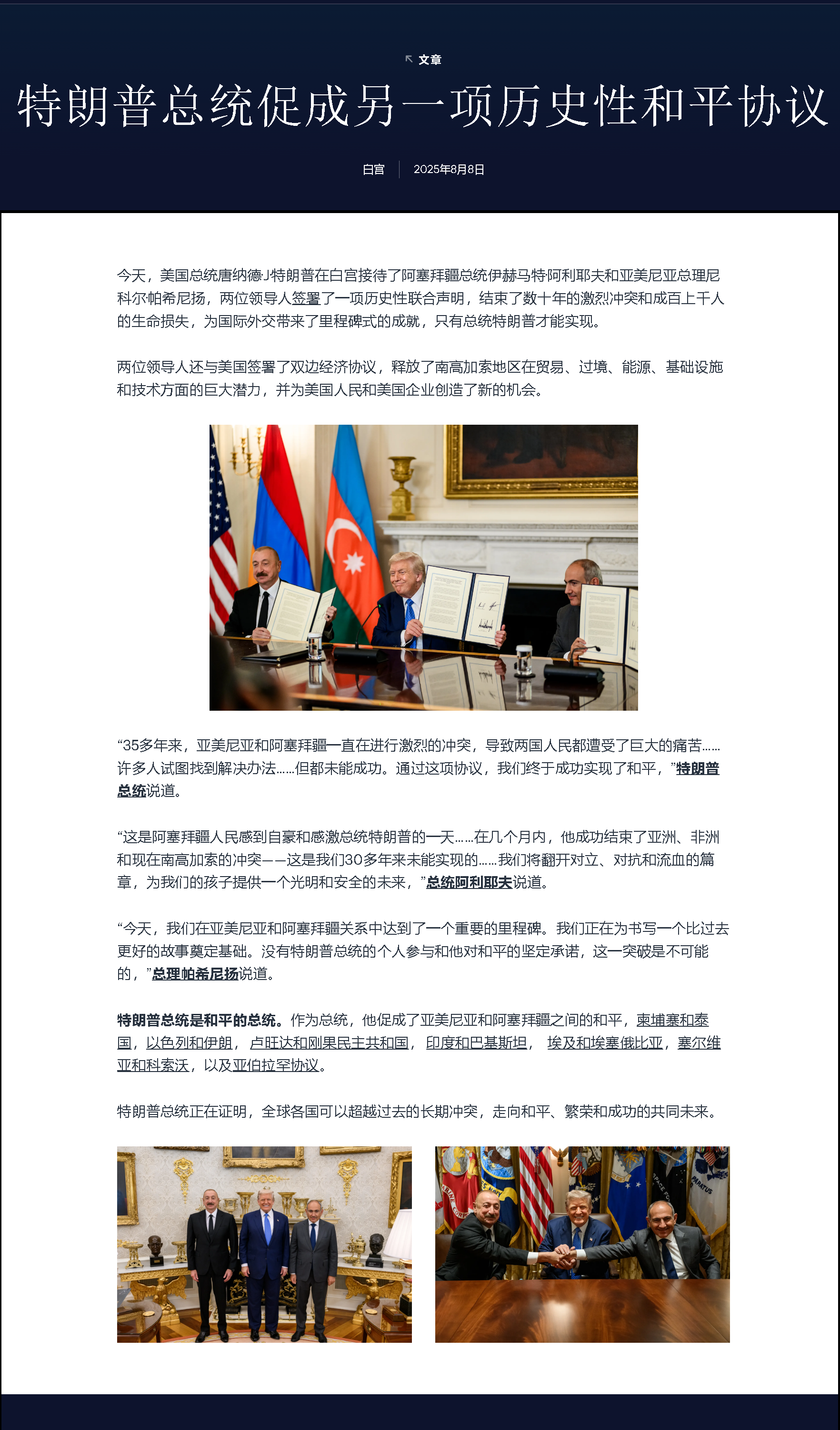 声明说,阿塞拜疆总统阿利耶夫和亚美尼亚总理帕什尼扬当天在美国华盛顿举行会晤,见证两国外长草签上述协议文本,两国将采取进一步措施以最终签署并批准该协议。声明说,历经冲突后,在基于边界不可侵犯及禁止使用武力夺取领土的原则上,两国建立睦邻关系的条件终于得以创建。这一现实为结束两国敌对历史开辟了道路。