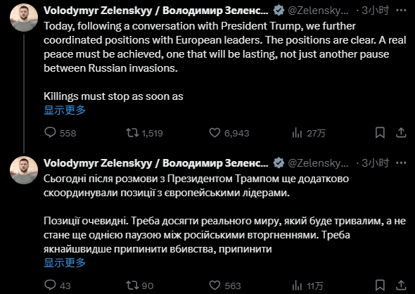 “大家都认为,结束冲突的最佳方式是直接达成和平协议,这将结束战争,而不是仅仅达成停火协议,因为停火协议往往行不通,”特朗普写道,“如果一切顺利”,他将很快安排与普京和泽连斯基举行三边峰会。他强调:“这可能会挽救数百万人的生命。”