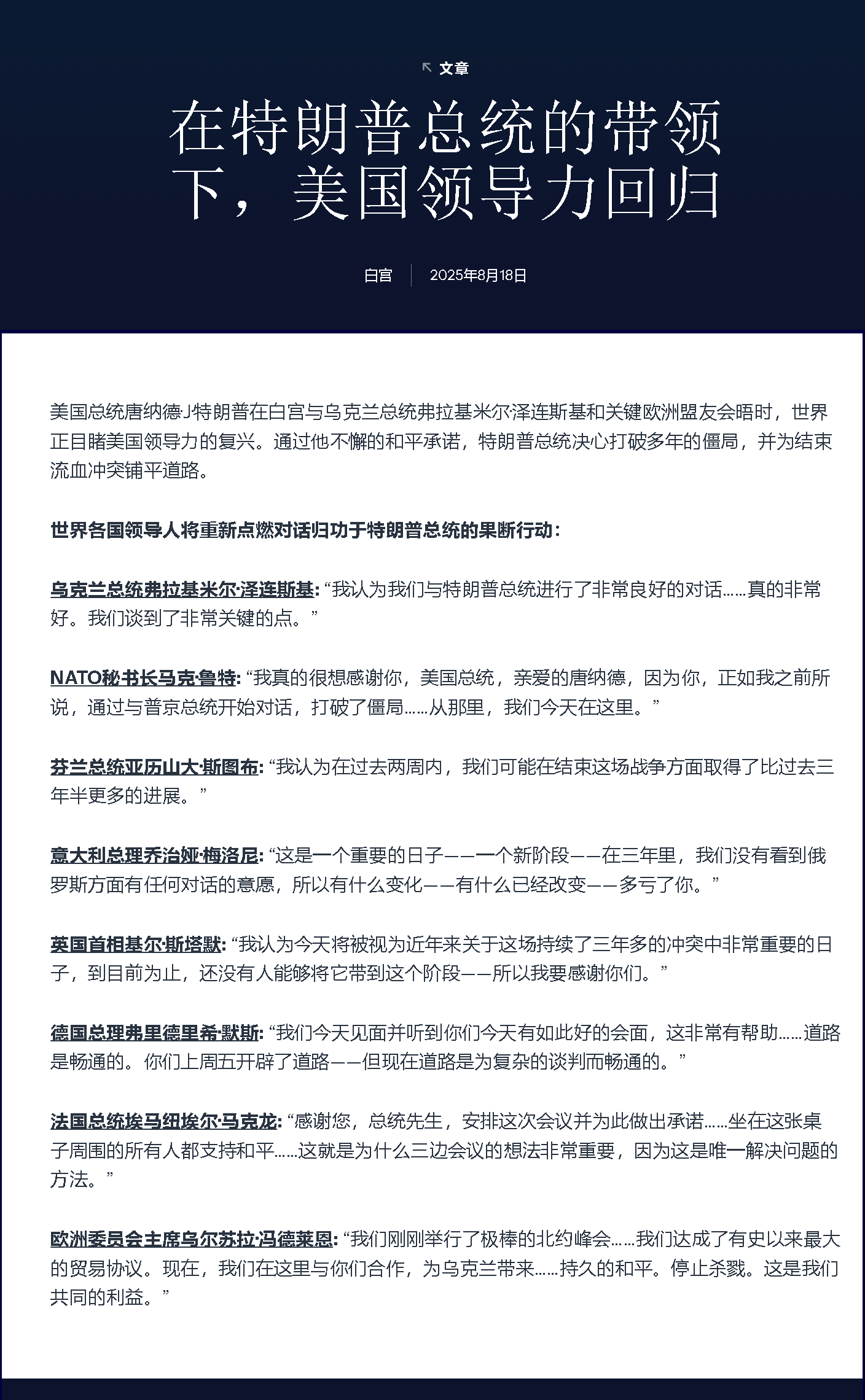 世界各国领导人将重新点燃对话归功于特朗普总统的果断行动: