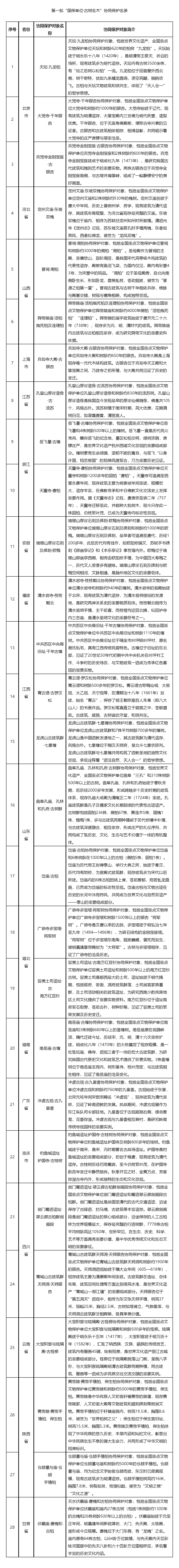 本报北京10月8日电(记者赵晓霞)记者从国家文物局获悉,日前,国家文物局办公室、国家林草局办公室、住房城乡建设部办公厅公布了第一批“国保单位·古树名木”协同保护名录。名录中的协同保护对象包括天坛·九龙柏、定州文庙·东坡双槐、晋祠·周柏等28个,分布在北京、河北、山西、上海、江苏等地。