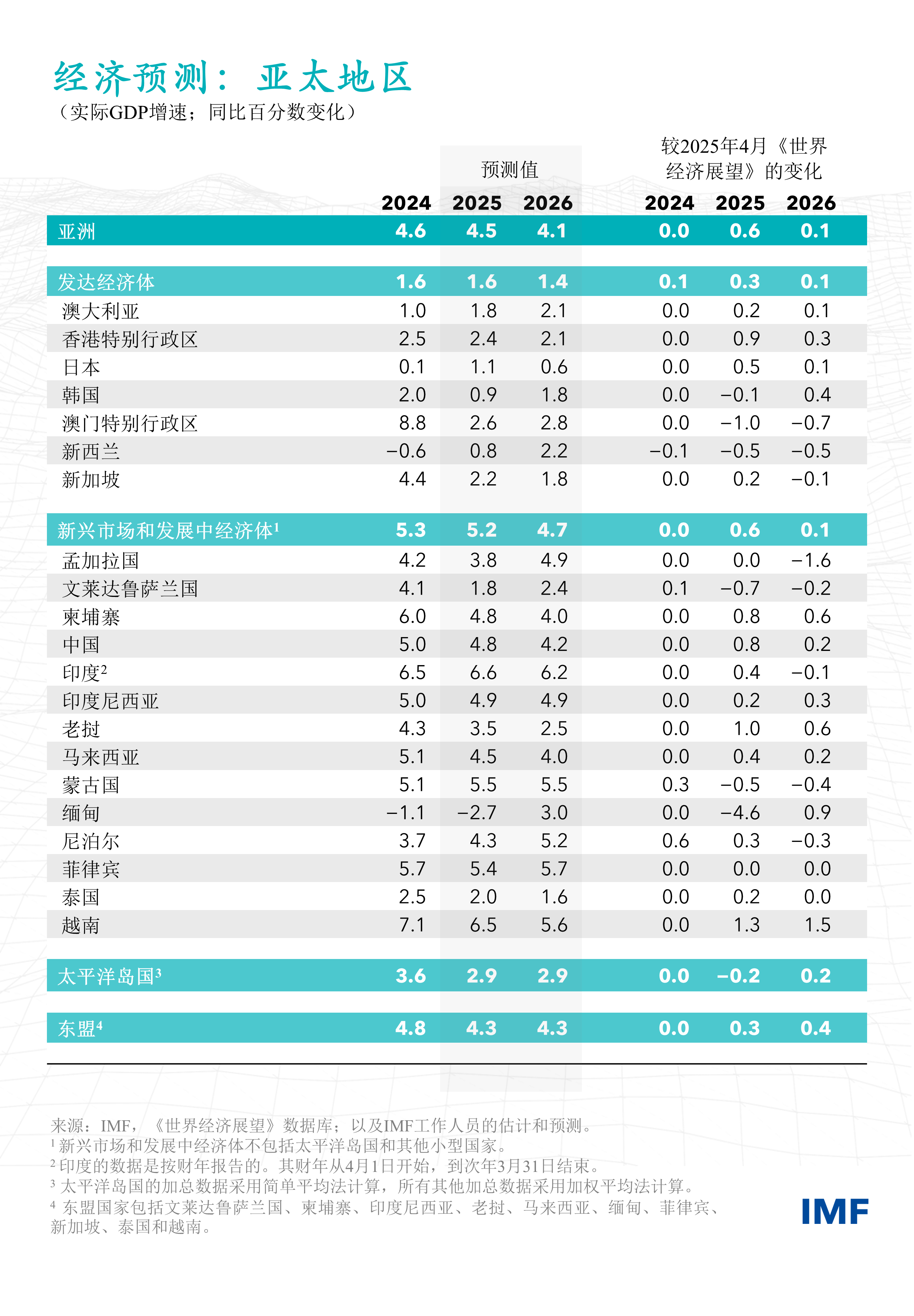 新华社香港10月24日电(黄茜恬)国际货币基金组织(IMF)24日在香港发布最新一期亚太地区经济展望报告,预计2025年亚太地区经济增速为4.5%,比4月预测提高0.6个百分点。