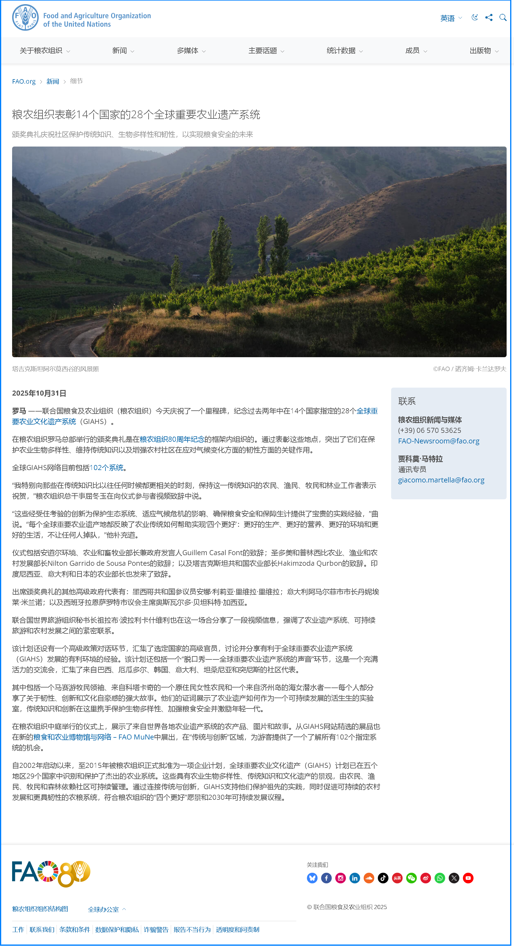 新华社罗马10月31日电(记者刁泽)10月31日,由联合国粮农组织主办的全球重要农业文化遗产授牌仪式在意大利首都罗马举行。此次活动是粮农组织成立80周年系列活动之一,为2023年以来新认定的全球重要农业文化遗产举办集中授牌与交流。
