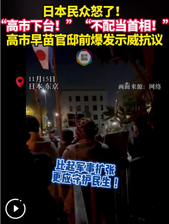 当地时间15日晚,约百名日本民众在位于东京的首相官邸前举行抗议活动,对首相高市早苗近期错误言行表达强烈不满。