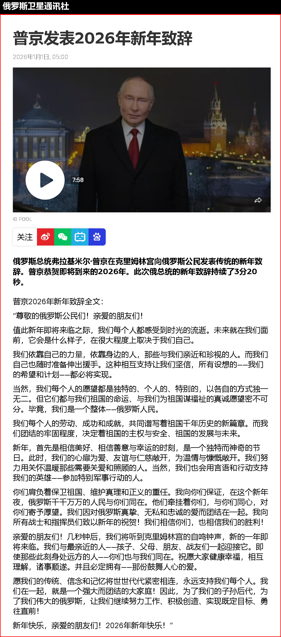 新华社莫斯科12月31日电 俄罗斯总统普京12月31日向俄民众发表新年贺词时,向参加对乌克兰特别军事行动的俄罗斯军人表达支持,并说“相信我们终将胜利”。