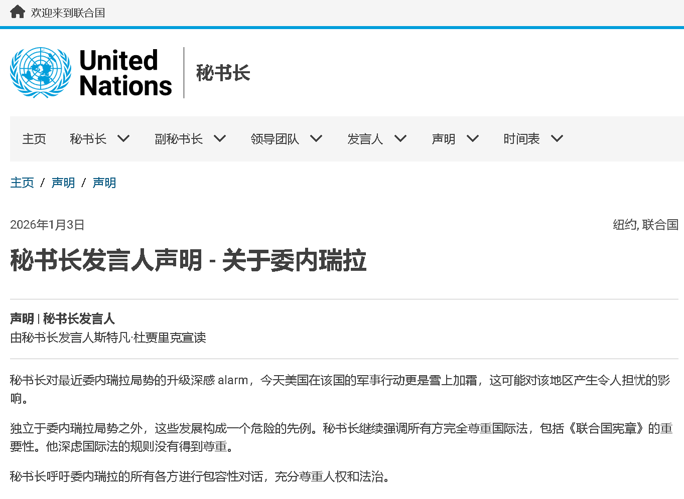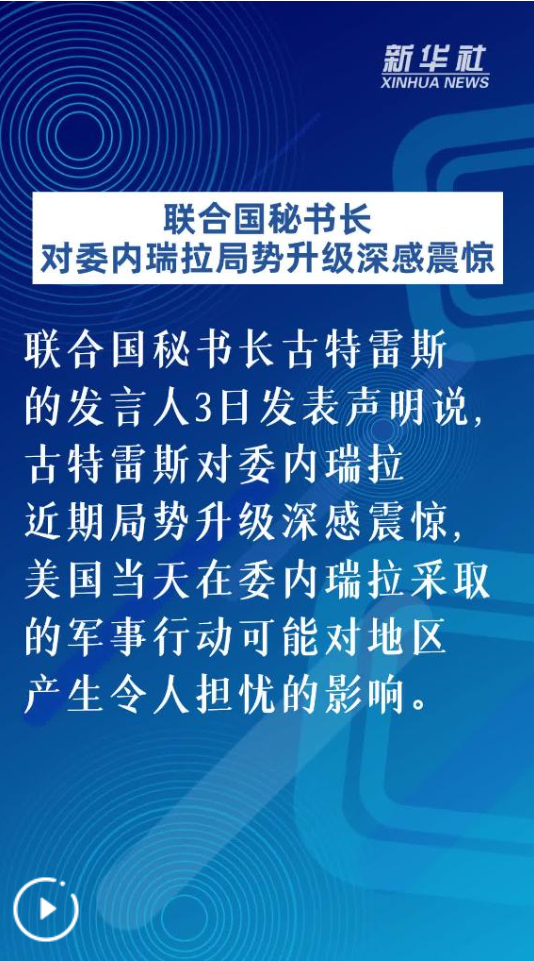 ,古特雷斯对委内瑞拉近期局势升级深感震惊,美国当天在委内瑞拉采取的军事行动可能对地区产生令人担忧的影响。