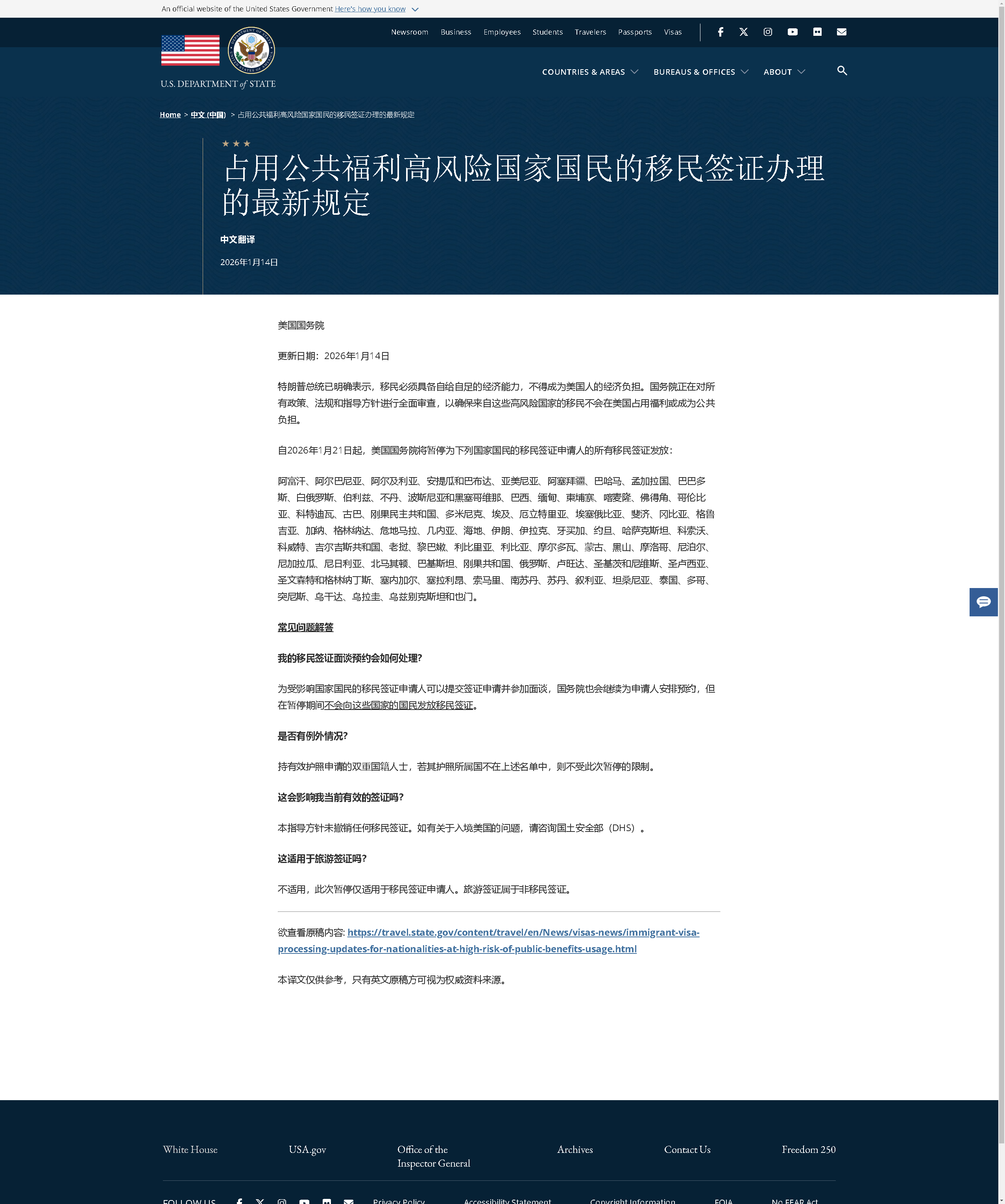 美国国务院称,“这些国家的移民抵达美国后往往会成为公共负担。美国政府将始终把美国放在首位。”