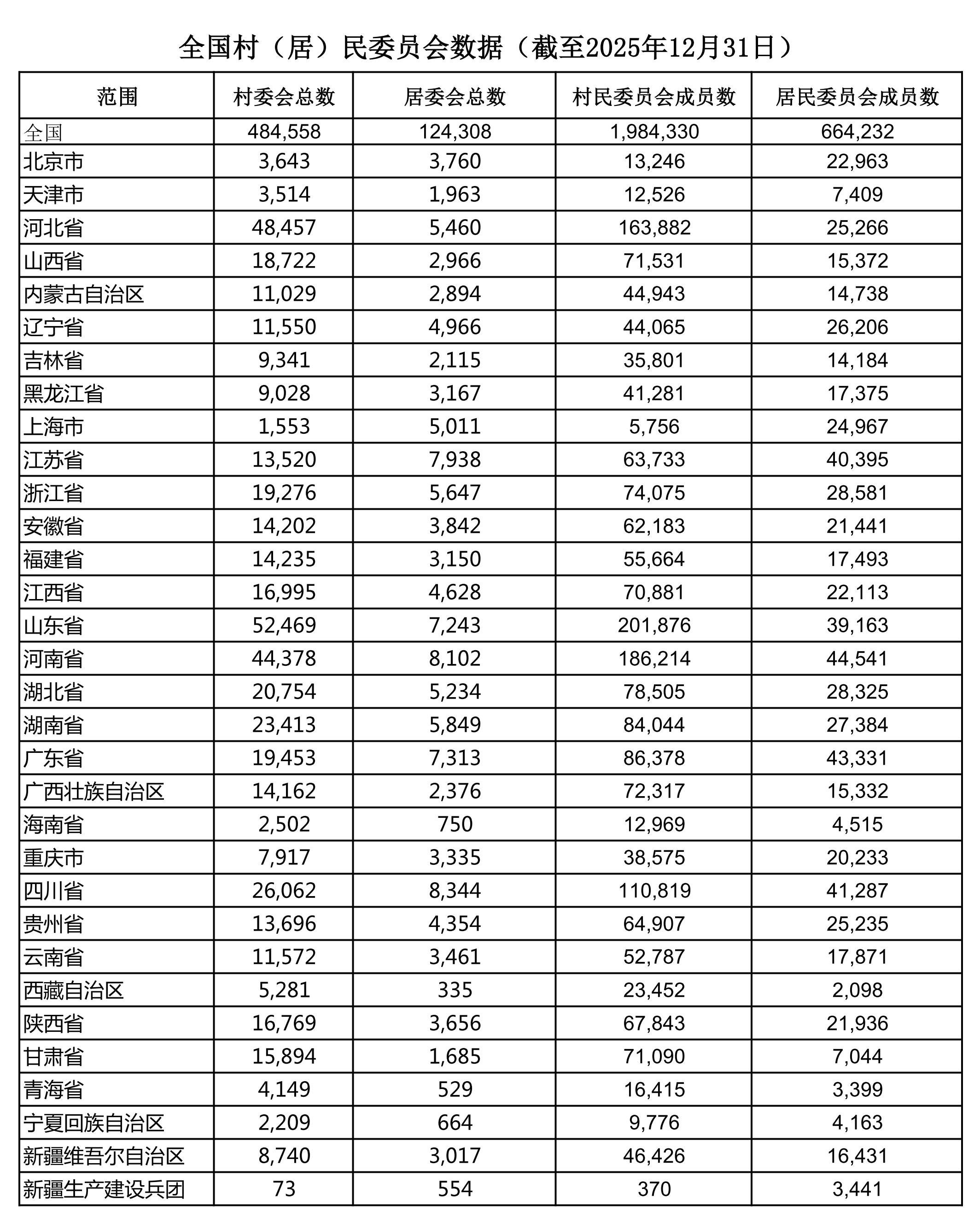 全国村(居)民委员会数据(截至2025年12月31日) 2026-02-13