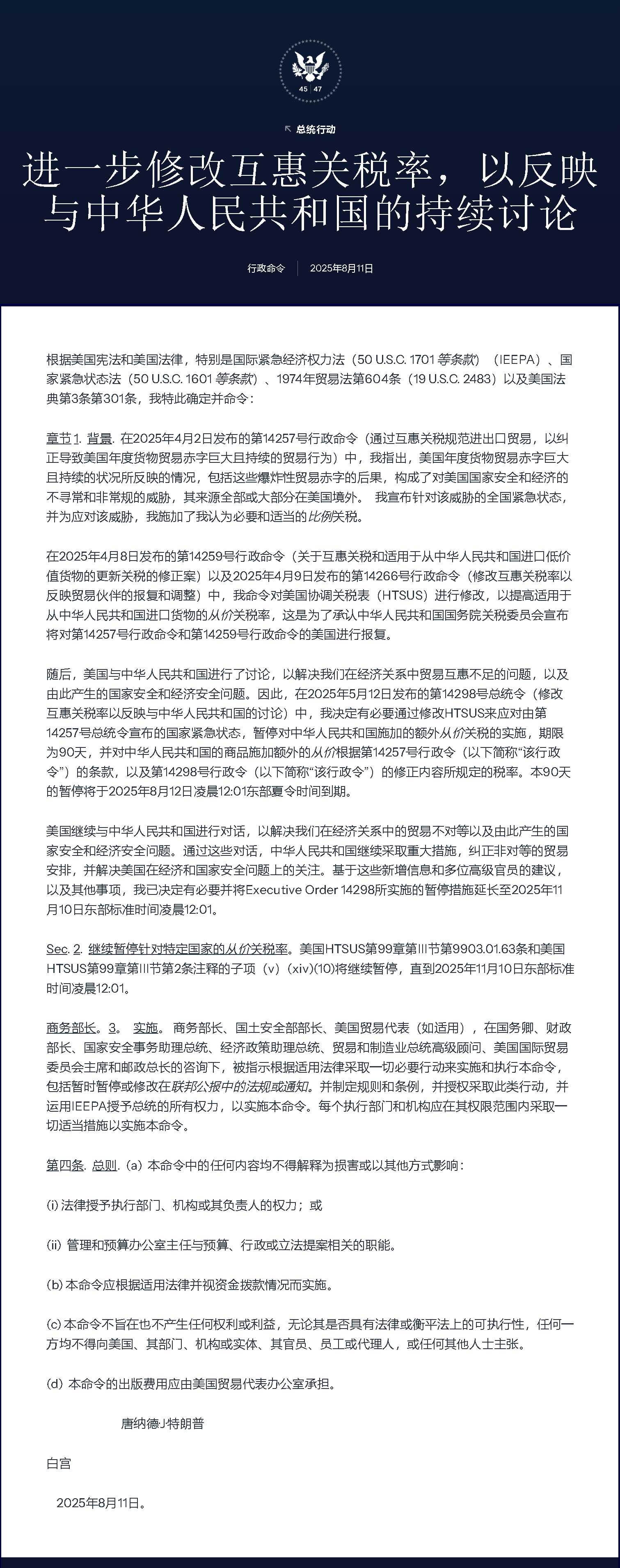 美国继续与中华人民共和国进行对话,以解决我们在经济关系中的贸易互惠性不足问题,以及由此产生的国家安全和经济安全问题。通过这些对话,中华人民共和国继续采取重大措施,纠正非互惠贸易安排,并解决美国在经济和国家安全问题上的关切。基于这些新增信息和来自多位高级官员的建议,以及其他事项,我已决定有必要并将Executive Order 14298所实施的暂停措施延长至2025年11月10日东部标准时间凌晨12:01。