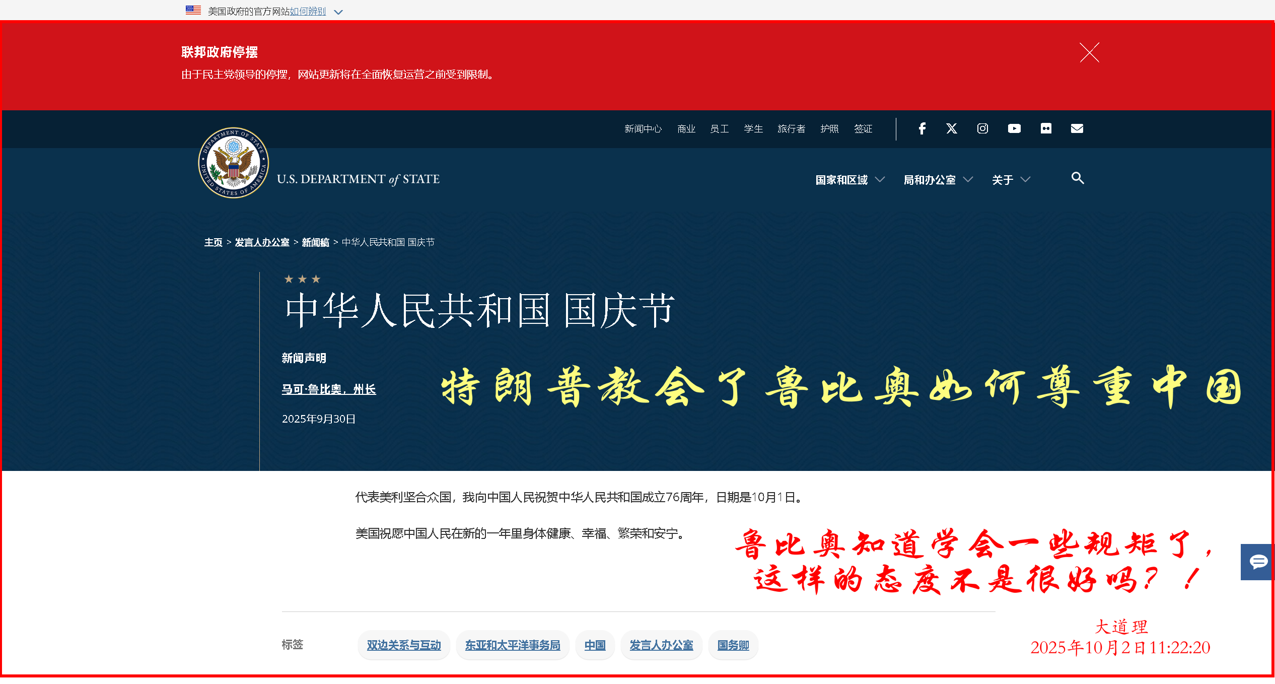 根据美国国务院网站当地时间9月30日消息,美国国务卿鲁比奥发表简短声明:我谨代表美利坚合众国,就中华人民共和国成立76周年表示祝贺。