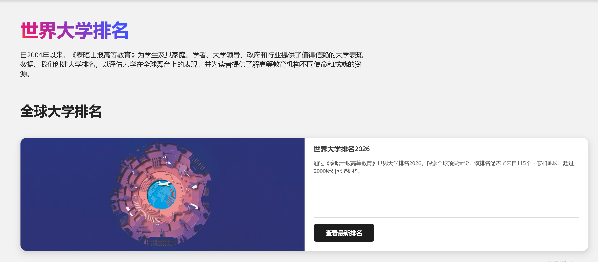 10月9日,泰晤士高等教育(THE)发布了2026年世界大学排名的结果。2026年泰晤士高等教育世界大学排名涵盖115个国家/地区,共有2,191所高校上榜,再创历史新高。
