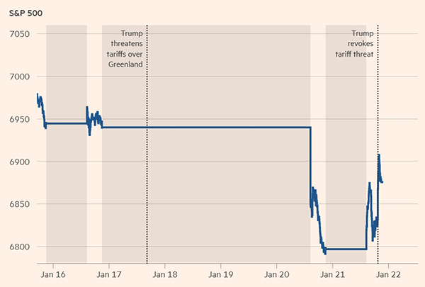 特朗普就格陵兰问题发出关税威胁后,标普500指数变化。 《金融时报》制图