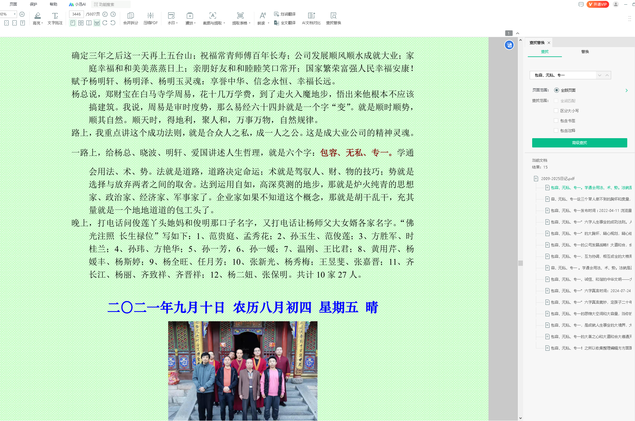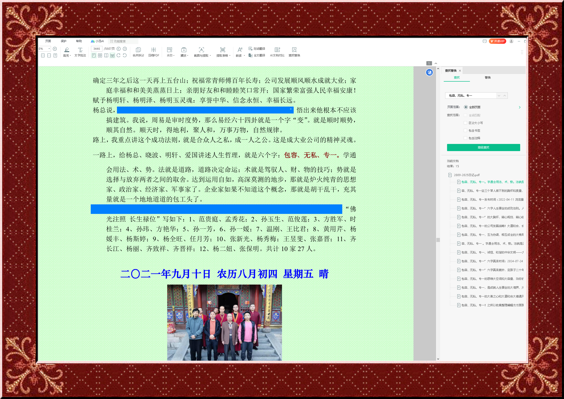 2021年9月9日,在前往五台山的路上,我把此次拜谒文殊菩萨开悟的方法,总结讲给同车一行四人。就是六个字:包容、无私、专一。学通会用法、术、势。法就是道路,道路决定命运;术就是驾驭人、财、物的技巧;势就是选择与放弃两者之间的取舍。达到运用自如,高深莫测的地步,那就是炉火纯青的思想家、政治家、经济家、军事家了。