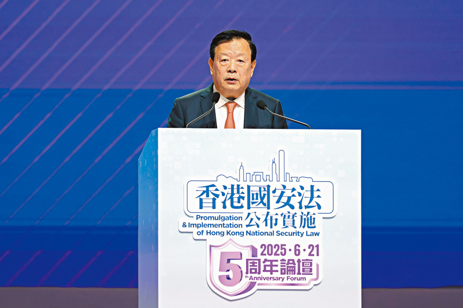 夏宝龙昨日上午在香港国安法公布实施5周年论坛上致辞表示,2020年6月30日,国家主席习近平签署第49号主席令,公布实施《中华人民共和国香港特别行政区维护国家安全法》。从此,香港维护国家安全「不设防」的历史一去不复返,开启了「一国两制」实践的新征程。 5年来的实践证明,香港国安法是捍卫「一国两制」、维护香港繁荣稳定的「守护神」,是一部具有重大历史意义和现实意义的好法律。