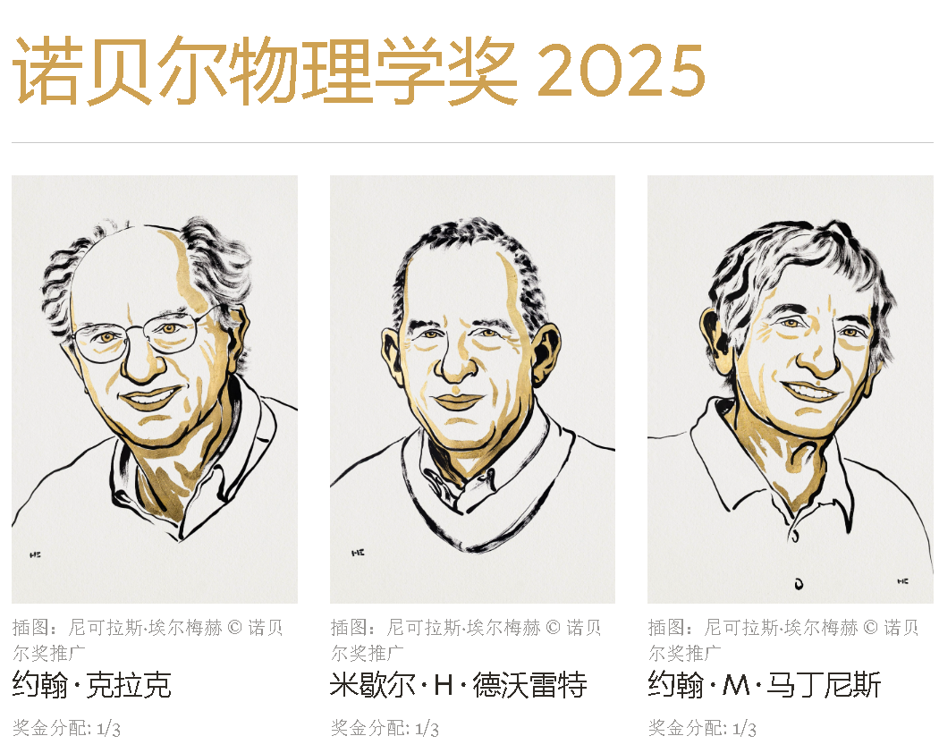 新华社斯德哥尔摩10月7日电(记者郭爽 张兆卿)在量子力学诞生百年之际,瑞典皇家科学院7日宣布,将2025年诺贝尔物理学奖授予约翰·克拉克、米歇尔·H·德沃雷和约翰·M·马蒂尼斯三名量子物理学家,以表彰他们在电路中实现宏观量子力学隧穿效应和能量量子化方面的贡献。