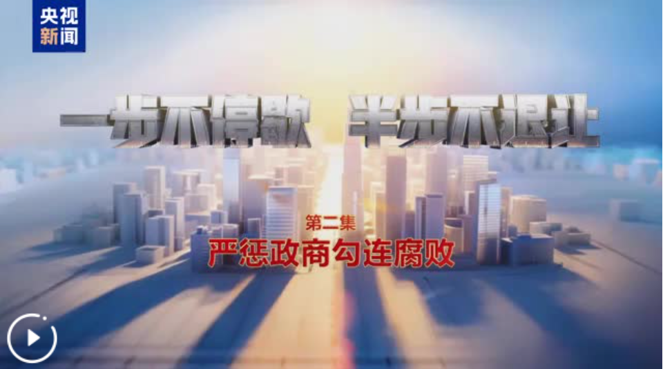 由中央纪委国家监委宣传部与中央广播电视总台央视联合摄制的电视专题片《一步不停歇 半步不退让》,1月12日在总台央视综合频道晚8点档播出第二集《严惩政商勾连腐败》,央视新闻新媒体平台同步播发。