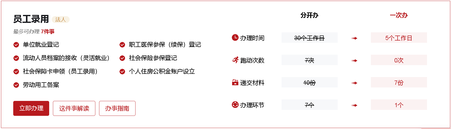 据悉,此次上线的“员工录用一件事”服务对象覆盖山西范围内所有用人企业,整合人社部门负责的单位就业登记、社会保险参保登记、社会保障卡申领、流动人员档案接收(员工录用)、劳动用工备案,医保部门负责的职工医疗保险参保(续保)登记,以及住建部门负责的个人住房公积金账户设立在内的7项高频关联事项。以往企业需分别对接多个部门、跑7次窗口、历经30个工作日才能办结的业务,如今办理环节压缩至1个,在材料齐全、符合受理条件的情况下,最快1个工作日即可办结,最长不超过5个工作日,且全程不收取任何费用。