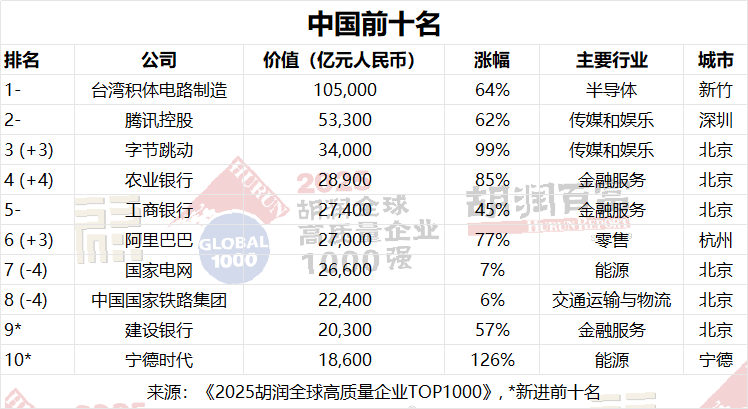 中国上榜企业中,表现最好的是台积电(增长4.1万亿元)和腾讯(增长2万亿元)。其他表现突出的企业还包括字节跳动(增长1.7万亿元)、农业银行(增长1.3万亿元)和阿里巴巴(增长1.2万亿元)。