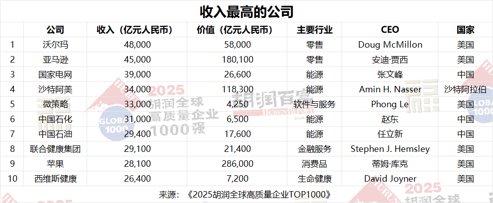 沃尔玛的年收入最高,达4.8万亿元人民币,其次是亚马逊(4.5万亿元人民币)和中国国家电网(3.9万亿元人民币)