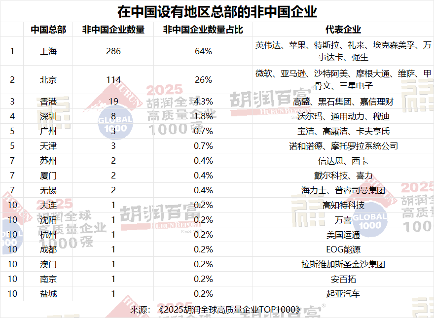 在上榜的非中国企业中,半数以上(已知446家)在中国设有地区总部,其中64%在上海,26%在北京。