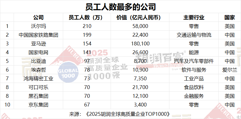 沃尔玛仍然是员工人数最多的上榜企业,拥有210万名员工。紧随其后的是中国国家铁路集团,凭借其覆盖全国的庞大运输网络,雇用了199万名员工。亚马逊排名第三,拥有154万名员工,反映了其庞大的全球履行和物流业务。