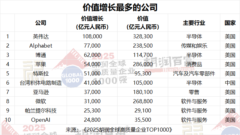 英伟达是今年价值增长最多的公司,增加了10.8万亿元人民币,其次是Alphabet(7.7万亿元人民币)和博通(6.2万亿元人民币)