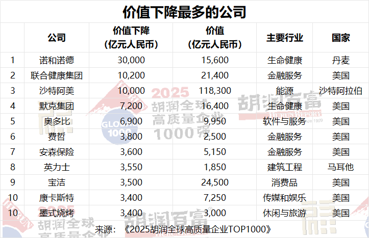 价值下降最多的上榜企业是诺和诺德,减少了3万亿元人民币,至1.6万亿元人民币,反映出该公司减肥药组合历经多年高速增长后,投资者情绪有所回落。联合健康集团的价值下降了1万亿元人民币,至2.1万亿元人民币,受到监管审查和医疗成本压力上升的影响。沙特阿美价值下降了1万亿元人民币,至11.8万亿元人民币,原因是油价走软和能源行业市盈率走弱。奥多比下跌6900亿元人民币至9950亿元人民币,原因是人工智能驱动的创意软件面临竞争压力。
