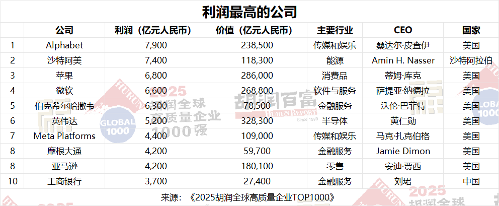 Alphabet是利润最高的上榜企业,达7900亿元人民币,得益于强劲的数字广告表现和人工智能服务的快速增长。沙特阿美以7400亿元人民币紧随其后,反映出其在全球能源市场的主导地位。苹果排名第三,凭借对其高端设备和服务生态系统的强劲需求,创造了6800亿元人民币的利润。