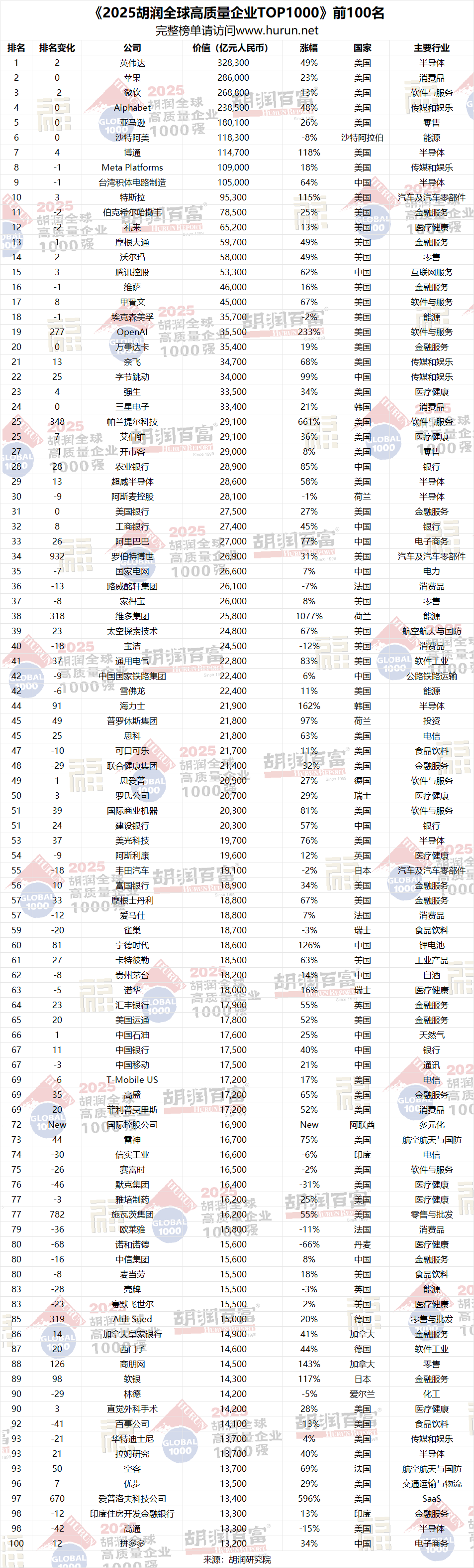 (2025年12月16日,深圳)提供有质量的榜单与调研的胡润研究院今日于深圳市福田区发布《2025胡润全球高质量企业TOP1000》(2025 Hurun Global 1000)。本次榜单主要以企业市值或估值为依据,并综合考量创新能力、可持续发展、社会责任、市场影响力等多维度指标,旨在甄选出全球价值最高的企业。上市公司市值按照2025年11月14日的收盘价计算,非上市公司估值参照同行业上市公司或最新一轮融资情况进行估算。这是胡润研究院连续第二次发布该榜单。