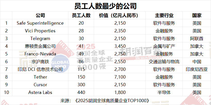 胡润全球高质量企业TOP1000包括一批超精益公司,这些公司以非常小的团队创造了巨大的价值。