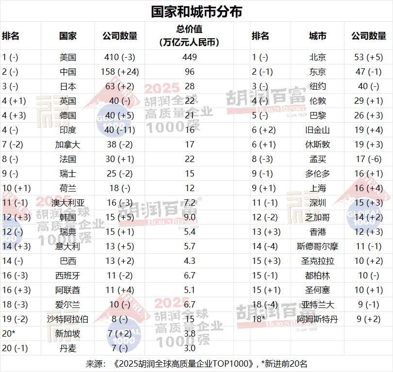 “从国家来看,美国继续以410家公司领先,减少了3家,在胡润全球1000强榜单中占40%,占总价值的57%。中国以158家公司排名第二,但增加了24家新面孔。美国和中国合计占全球总数的近60%。”