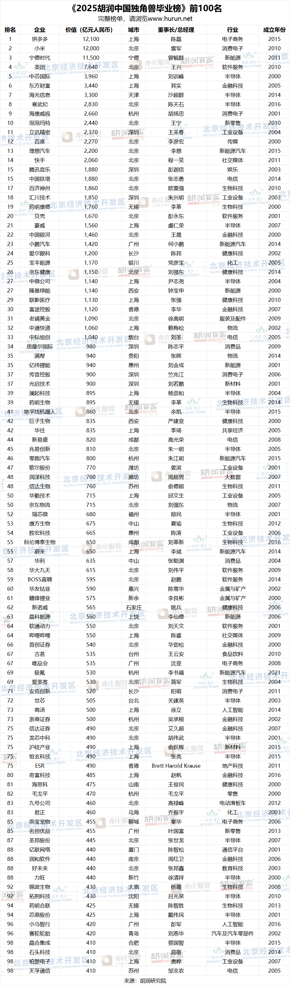 胡润研究院今日于北京亦庄发布《2025胡润中国独角兽毕业榜》(Hurun China Unicorn Graduates 2025 - In Search of China's Most Successful Former Unicorns),列出了中国成立于2000年之后、价值10亿美元以上的上市公司,按照企业价值进行排名。本次榜单估值计算的截止日期为2025年5月15日。这是胡润研究院首次发布该榜单。