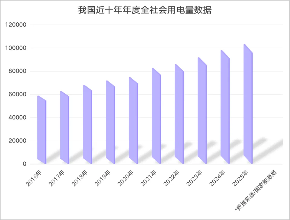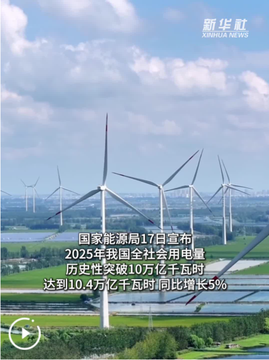 新华社北京1月17日电(记者戴小河、王悦阳)国家能源局17日宣布,2025年我国全社会用电量历史性突破10万亿千瓦时,达到10.4万亿千瓦时,同比增长5%。这一数字在全球单一国家中尚属首次,相当于美国全年用电量的两倍多,超过欧盟、俄罗斯、印度、日本四个经济体的年用电量总和。