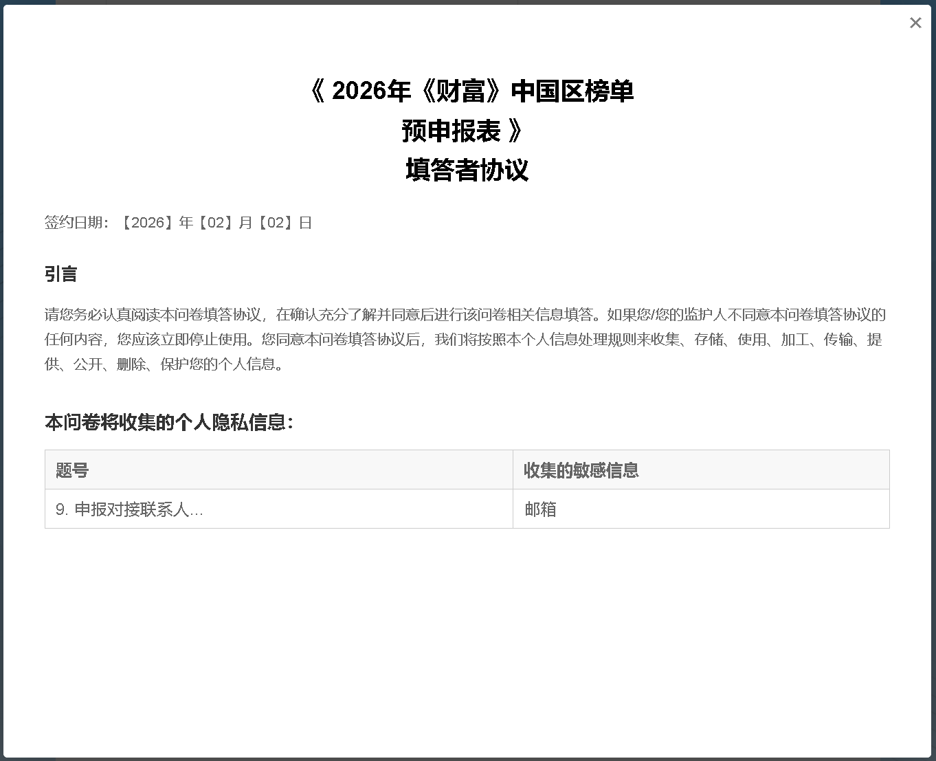 我们将协助问卷发布方收集您(作为问卷发布对象)主动填写的问卷内容(下称“问卷数据”,根据届时您填写的问卷数据,其中可能会包含您的个人信息)。请注意,您(作为问卷发布对象)应当自行判断向问卷发布方提供相应问卷数据的风险,一旦您填写并提交了问卷,相关问卷数据即归于问卷发布方控制,如您拒绝向问卷发布方提供问卷数据,请勿主动填写并提交问卷。