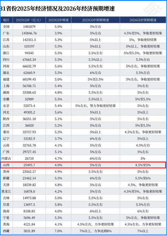 随着省级两会陆续闭幕,31个省份2026年经济增长目标悉数亮相,超七成省份不低于“5%左右”。整体来看,各地目标设定更加理性务实,工作重点突出“向新向优”,体现出在稳中求进中聚焦高质量发展、积极“跳起摸高”的思路。