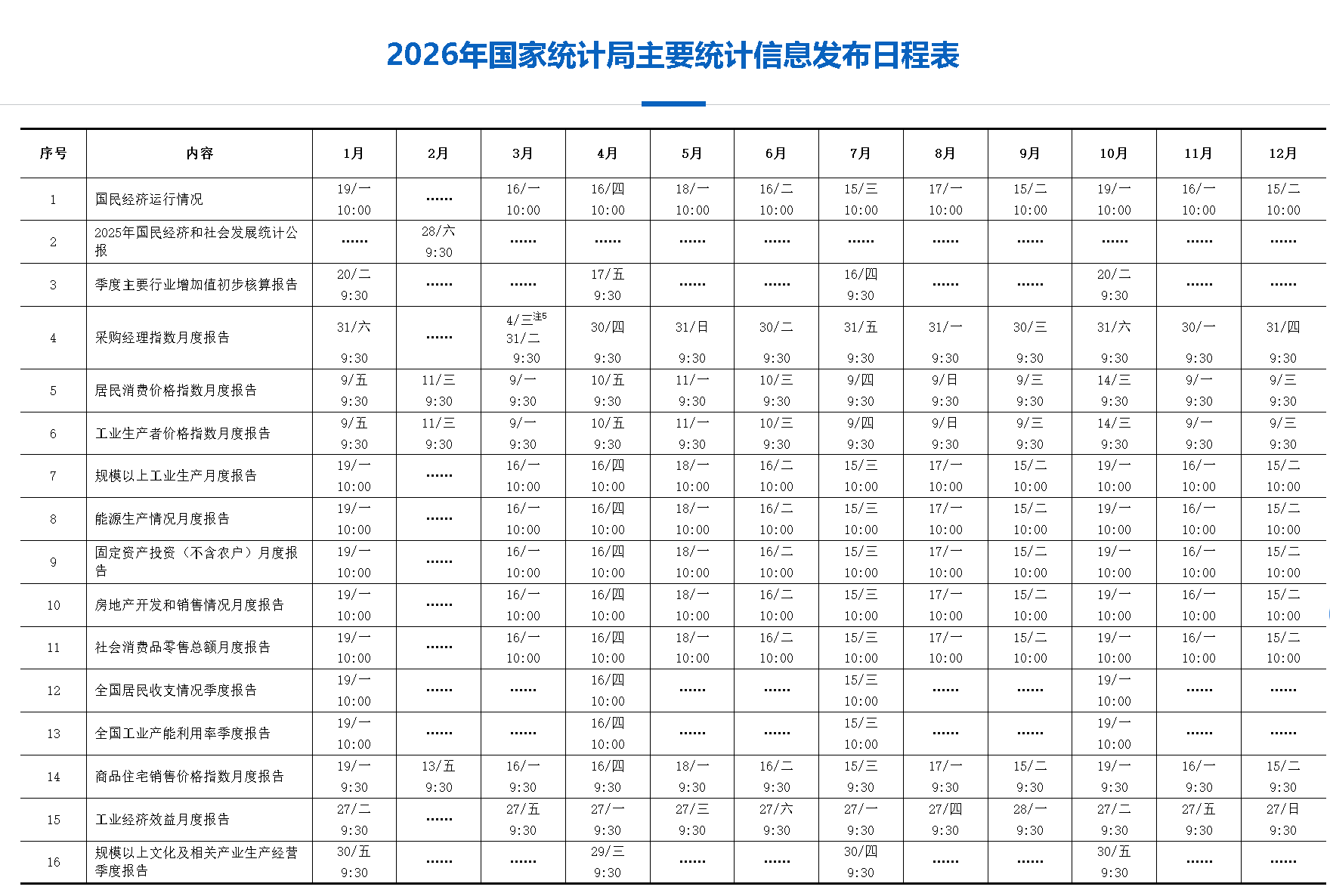 2024年国家统计局主要统计信息发布日程表2024-07-12