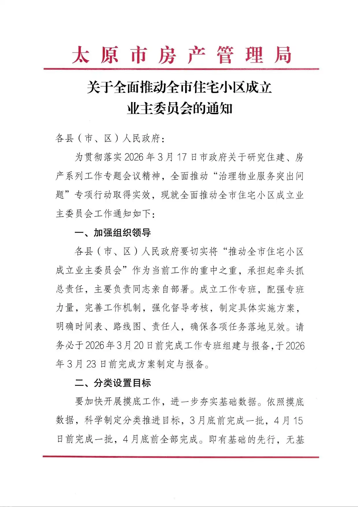 3月18日,山西省太原市房产管理局发布《关于全面推动全市住宅小区成立业主委员会的通知》。