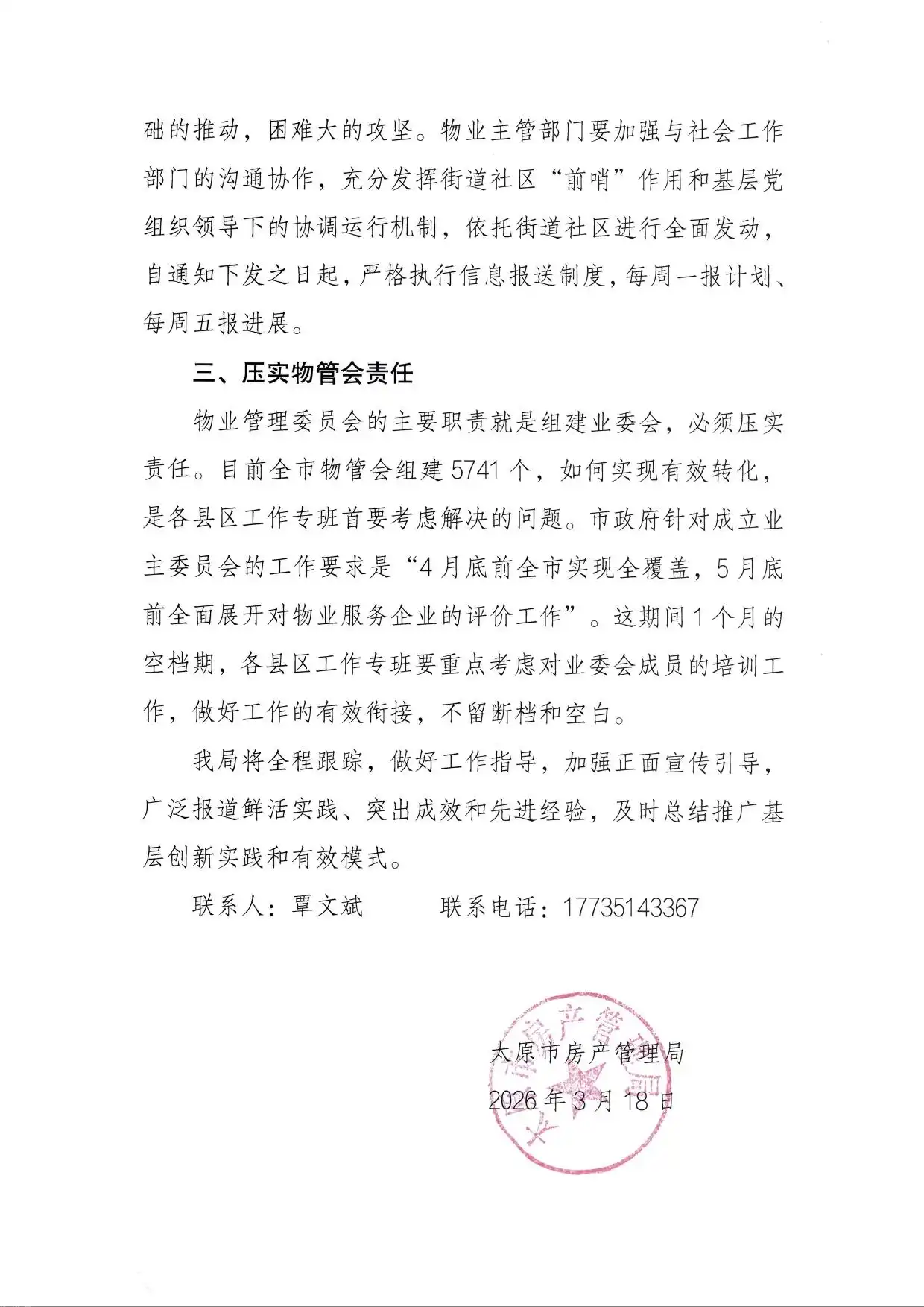 通知指出,物业管理委员会的主要职责就是组建业委会,目前太原全市物管会组建5741个,要实现有效转化。
