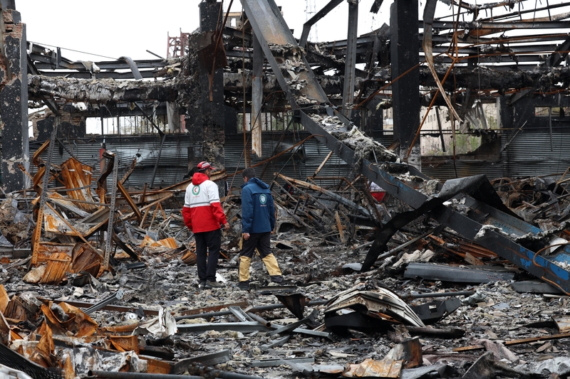 2026年3月28日,伊朗德黑兰市,伊朗红新月会成员站在遭空袭损毁的汽车服务中心现场。 IC Photo