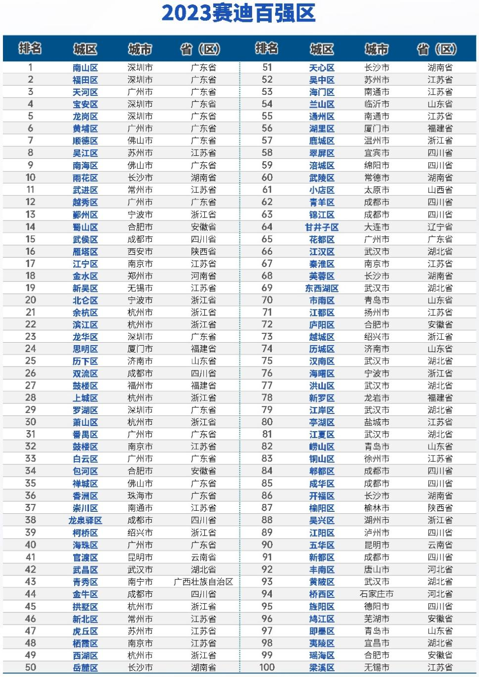 中国经济网北京8月9日讯(记者 李方) 城区是推动中国式现代化建设的“排头兵”和“主战场”。赛迪顾问8日发布研究显示,在2023年赛迪百强区中,深圳南山区、深圳福田区、广州天河区、深圳宝安区、深圳龙岗区、广州黄埔区、佛山顺德区、苏州吴江区、佛山南海区和长沙雨花区位列2023年赛迪百强区前“十强”。