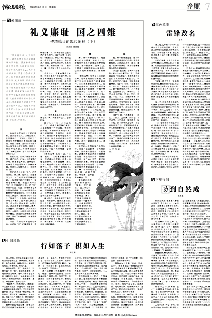 《管子》曰:“何谓四维?一曰礼,二曰义,三曰廉,四曰耻,礼不逾节,义不自进,廉不蔽恶,耻不从枉。故不逾节则上位安,不自进则民无巧诈,不蔽恶则行自全,不从枉则邪事不生。”如果大家都做到了礼义廉耻,那么社会上下就会秩序井然,每个人都会加强自我约束,尔虞我诈、歪风邪气自然也就没有了。管仲的这段著名言论流传千古,即使是到了今天,这段话依然道出了对个人修身、社会发展十分有益的见解,让人深受启发。