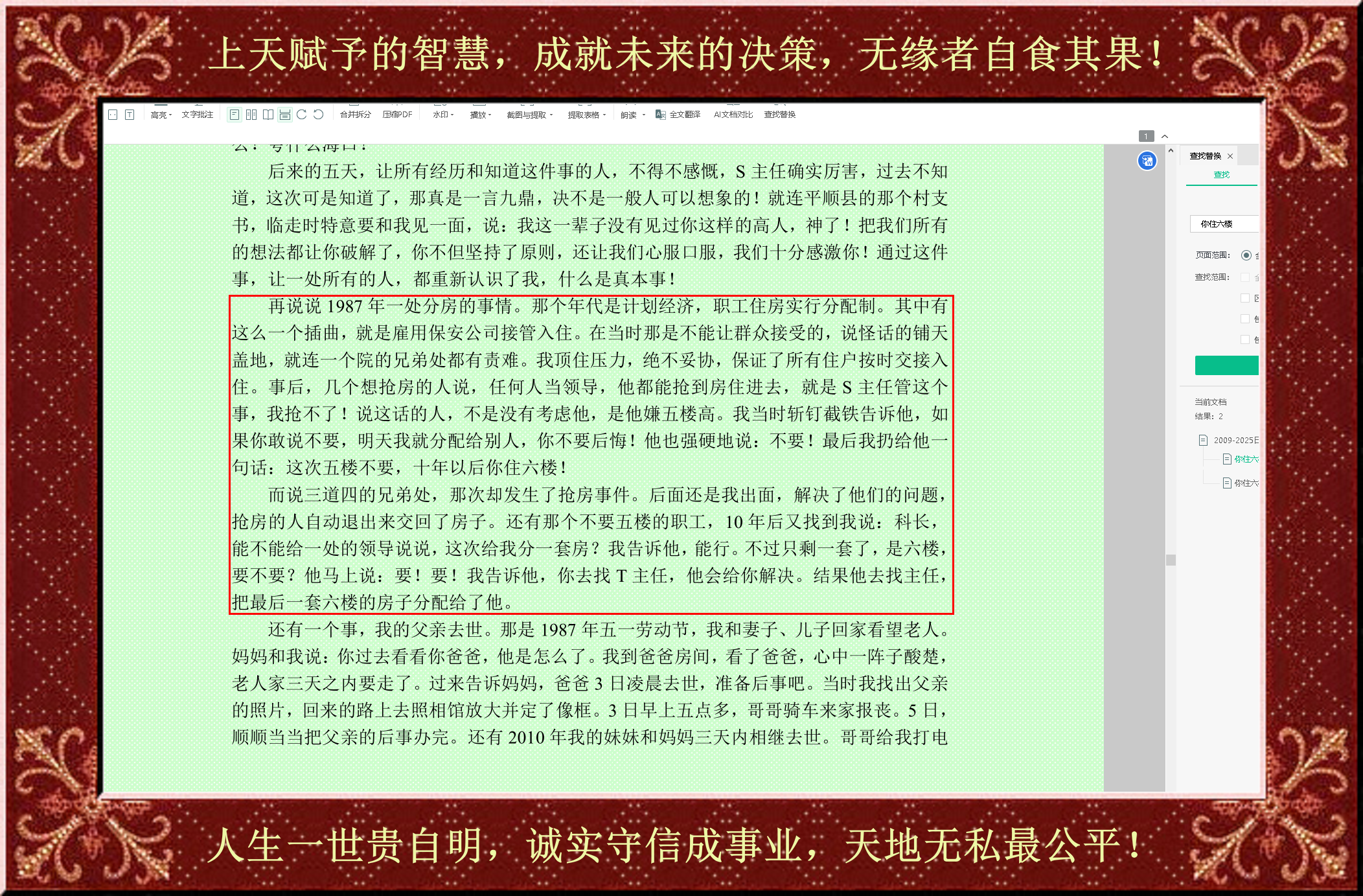 我的好朋友从中作梗,挑拨某人干涉分房办法。当时这个人被蒙蔽,一是想强行抢房,二是不接受分给他的房子。我果断采取措施,在关键的时间节点,安排保安公司进驻,断了他的非份之想;二是严历教育他不要自作聪明,并且告诉他这次五楼不要,十年后住六楼!