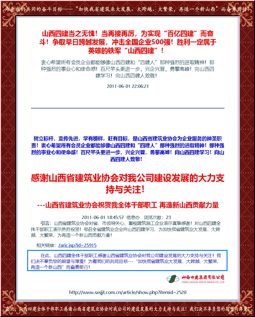 期望四建在新的五年中,积蓄冲击上市公司和世界500强的磅礴力量,继续发挥敢为人先的四建精神,把山西建筑业振兴的大任担当起来,创造令人刮目相看的企业辉煌——这才是山西四建应有的英雄本色!