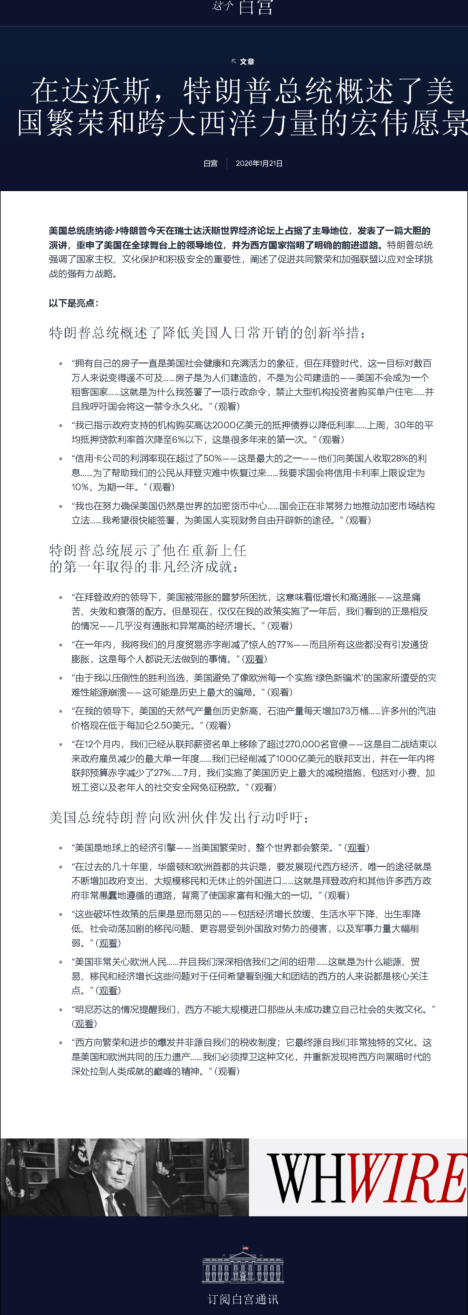 美国总统唐纳德·J·特朗普今天在瑞士达沃斯世界经济论坛上占据了主导地位,发表了一篇大胆的演讲,重申了美国在全球舞台上的领导地位,并为西方国家指明了明确的前进道路。特朗普总统强调了国家主权、文化保护和积极安全的重要性,阐述了促进共同繁荣和加强联盟以应对全球挑战的强有力战略。